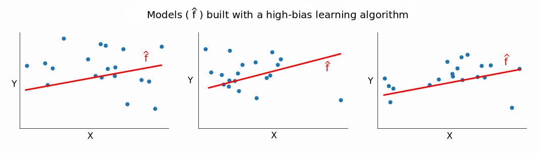 反过来也说得通:bias 越高,variance 越低。一个高 variance 的模型构建的简单模型通常是不能很好适应数据集的。当我们改变数据集的时候,从高 bias 的算法得到的模型 f^ 通常不会有很大不同。