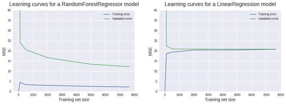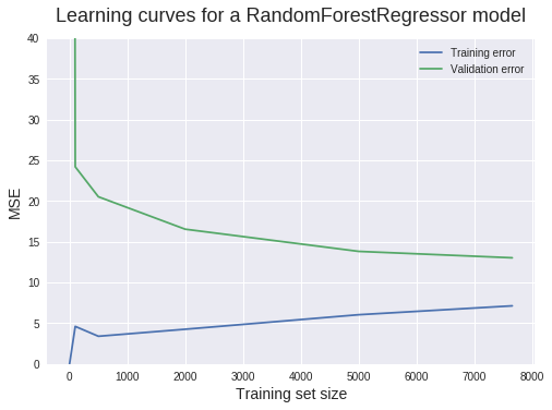 plt.ylim(0,40)### Plotting the two learning curves ###from sklearn.ensemble import RandomForestRegressor