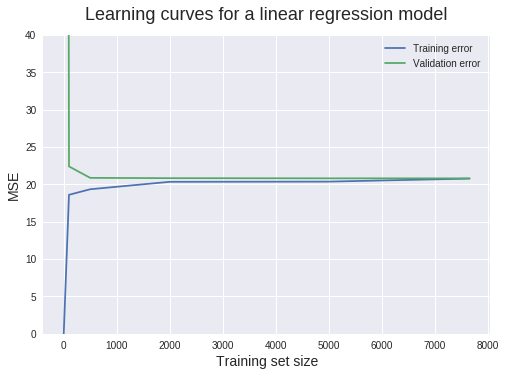 当训练集样本数为 100 的时候,训练过程的 MSE 会急剧增大,而验证过程的 MSE 会减小。这个线性回归模型不能完美地预测所有的 100 个数据点,所以 MSE 会大于 0。然而,此时训练集的性能仍然优于验证集,这是由于在验证集上估计了更多的数据。