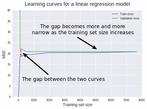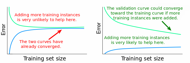 正如我们之前观察到的一样,如果 variance 比较大,那么说明模型过于拟合训练数据了。当模型过拟合的时候,它在泛化到从未见过的数据上时会存在问题。当这样一个模型分别在训练集和验证集上测试的时候,训练误差会比较低,验证误差通常会比较高。当我们改变训练集大小的时候,这种模式会继续存在,训练集和验证集之间的差距会决定这两个学习曲线之间的距离。