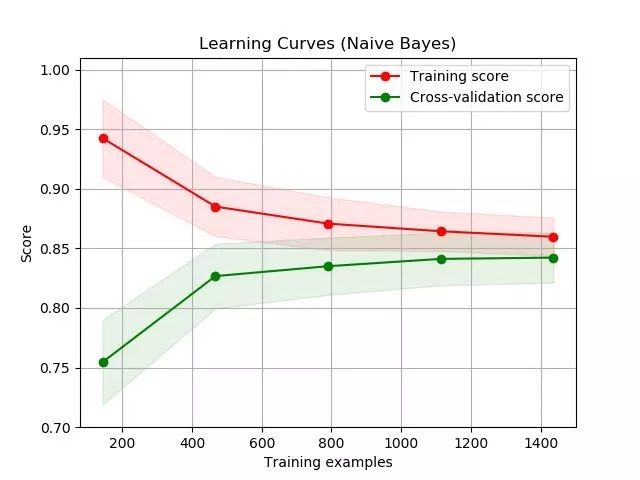 图源:scikit-learn 文档(http://scikit-learn.org/stable/auto_examples/model_selection/plot_learning_curve.html)