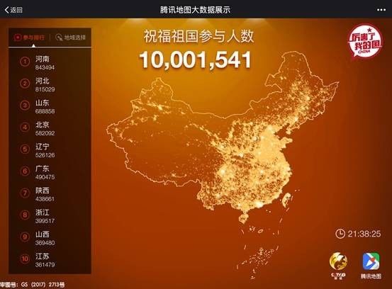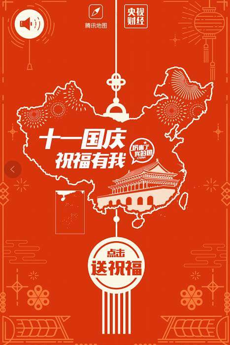 10月1日国庆节当天,在央视财经频道大型直播节目《厉害了我的国》中,一张逐渐被“点亮”的中国地图吸引了全国观众的关注。原来,这是由腾讯地图APP和央视财经频道共同打造的“十一国庆,祝福有我”H5送祝福活动。