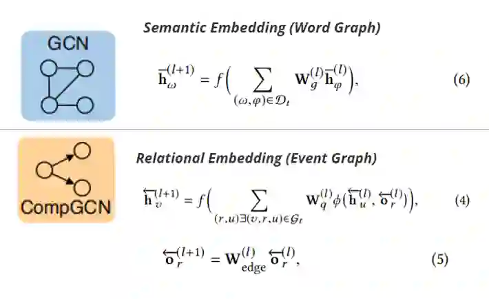 (1)针对事件图谱,我们利用CompGCN(多关系图神经网络)来对事件图谱的节点和边进行embedding(如下图的公式(4)(5)所示)。