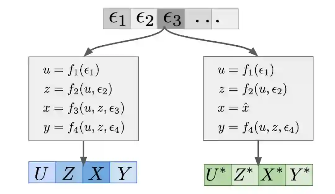 SEM 本质上是一种数据生成模型,在这个例子中,它使用了一些噪声数据 ϵ1,ϵ2,…然后将它们转变成观察变量 (U,Z,X,Y)。这个在上图的左边部分展示。现在,如果你想在干预 X=x^的情况下做反事实陈述,你可以构造一个残缺的 SEM,除了删除了 f3 并替换为一个常量赋值函数 x=x^之外,它与常规的 SEM 是完全一样的。这个修正版的 SEM 在上图中的右边。如果你将ϵ输入到残缺的 SEM 中,你会得到一个变量集 (U∗,Z∗,X∗,Y∗),如图中的绿色区域所示。这些就是孪生点的特征。(U,Z,X,Y) 和 (U∗,Z∗,X∗,Y∗) 中的这个联合生成模型定义了变量 (U,Z,X,Y,U∗,Z∗,X∗,Y∗) 的组成的集合上的联合分布。那么,现在你可以计算这个联合分布中的所有类型的条件概率和边际概率了。