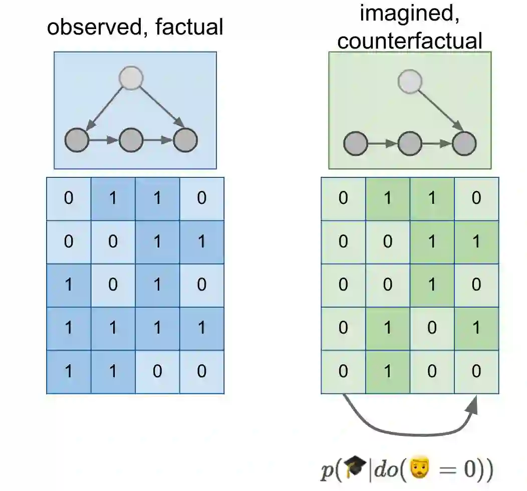 这个因果图让我们可以推断出另一个世界中的数据分布,如果你愿意的话,可以推算并行宇宙,在那里每个人都以某种方式被神奇地挂掉了胡须。你可以想象从这个分布中采样数据集,如绿色的表所示。我们可以测量这个绿色分布中博士学位和胡须之间的关联,这正是 p(🎓|do(🧔=0)) 的含义。如表格下方的箭头所示,p(🎓|do(🧔=0)) 是关于从绿色数据集中的一个列预测另一个列的概率。