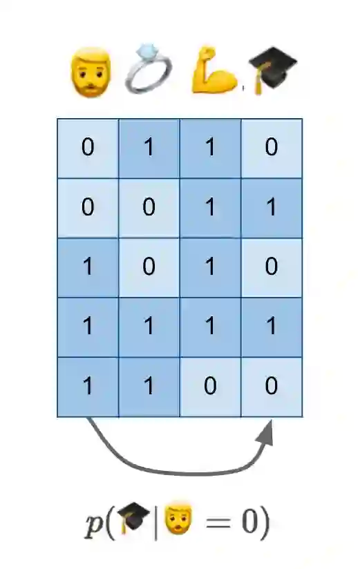 如果我们有这些数据并且用它们做常规的统计机器学习,不做因果推理,我们可能会尝试估计 p(🎓|🧔=0),即有胡子的情况下拥有博士学位的条件概率。正如我在图的底部展示的,这就像是从一列的数值来预测另一列的数值。