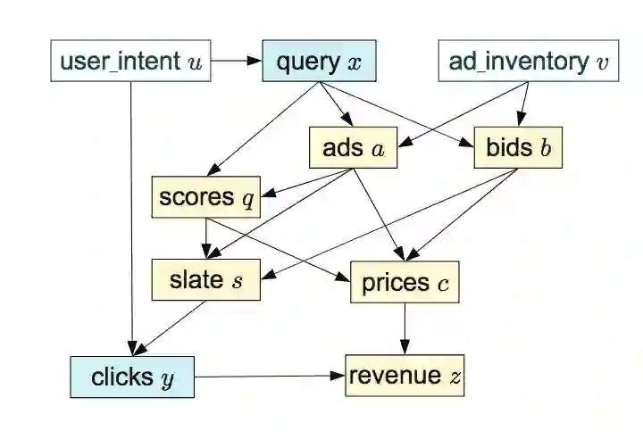 举个例子:下面是一个在线广告系统的因果图,此图取自 Bottou 等人的论文。