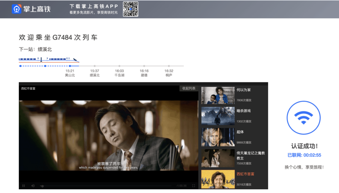 笔者尝试访问各种新闻类和搜索类网站,QQ、微信都没问题,但是像优酷、爱奇艺、腾讯视频这些网站是无法访问的,应该是这些视频网站的流量比较大,所以禁止了,但是只要你认证成功后,掌上高铁会有一些电影缓存在本地给乘客观看。