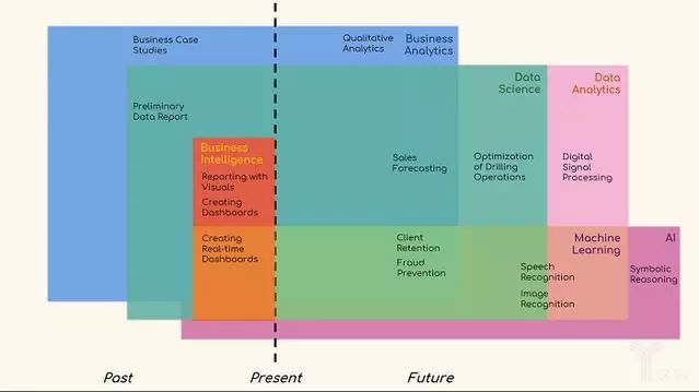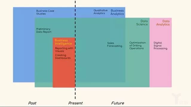 商业智能(BI)是否就一定意味着过去?不一定,但它没有涉及到预测分析。如图所示,回归、分类以及其他所有典型的预测方法都属于Data Science的一部分,但不是BI。而且,商业智能完全是数据科学的分支,因此,当一个人在处理过去事件时,用到描述性统计、报告或可视化时,这说明是在做BI和数据科学。