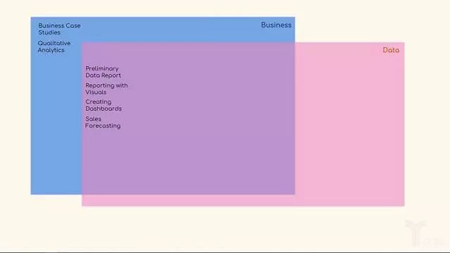 考虑到最初的选择,我们可以在业务和数据的交叉点中移动最近的四个术语,目前在图片中表示为紫色区域。这是因为“初步数据报告”,“视觉报告”,“创建仪表板”和“销售预测”属于数据驱动的商业活动。外部可以基于过去的知识、经验和行为反对存在商业活动范围内的“商业案例研究’和‘定性分析’,但你很快就会看到——这不是真正的数据科学。