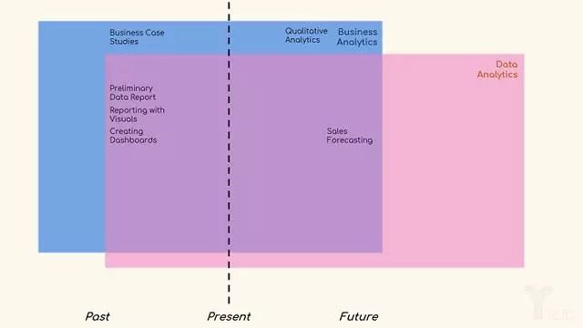 在“相对定义”的概念上,要更好地说明这些点,“数字信号处理”就是数据分析的一部分,但不是Data Science,也不是Business Analytics。数据、编程和数学开始发挥作用,但并不像我们在Data Science中使用它们一样。为了一致性,让我们用时间轴来完成这件事——数据科学既是左边的,也是右边的线(如同其他的)。这就给我们带来了一个问题:是不是所有的领域都具有“过去属性”?