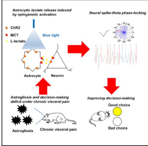 王立平团队和李婴团队利用光遗传技术、动物行为学结合活体电生理技术等方法,发现:慢性痛大鼠模型中的动物决策认知功能显著下降,其内在神经环路机制在于外侧杏仁核(BLA)-前扣带回(ACC)的神经活动的同步性显著降低;光遗传特异性刺激ACC脑区的星形胶质细胞,可以有效提高局部微环路中的乳酸(L-Lactate)的浓度,进而增强上述两个脑区之间的同步性,有效改善慢性痛对大鼠决策认知能力的影响。该研究从胶质细胞基础代谢的角度为决策的脑认知神经基础提出了新的模型,也为临床干预治疗慢性痛的大脑认知功能缺损提供了新思路。