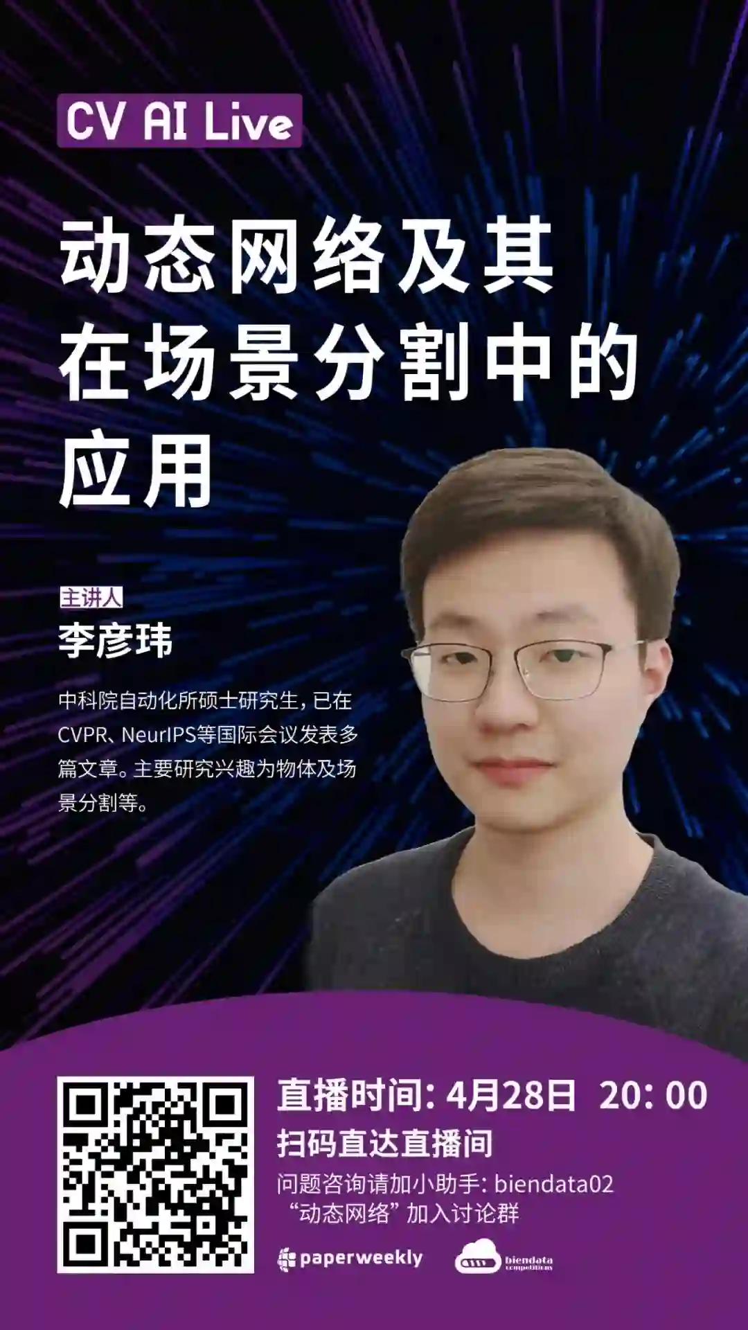 本次直播将在 PaperWeekly B 站直播间进行直播,扫描下方海报二维码或点击阅读原文即可免费观看。线上分享结束后,嘉宾还将在直播交流群内实时 QA,添加小助手微信 biendata02 备注「动态网络」,即可获取入群通道。