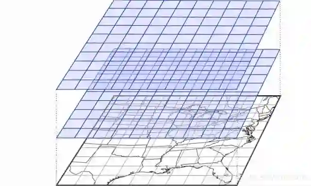 当我们固定某一要素某一预报时效,那么高度、经度、纬度就构成一个三维网格数据,如下图所示(图片来自互联网)。每个格点代表了一个三维空间上的点,上面的数值为该点在某一预报时效(比如未来三小时)下,某一物理量(比如温度)的预报值。