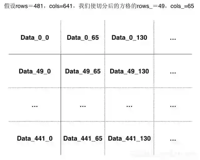 为了满足“查询某个格点的时间序列数据”的需求,我们想到通过对数据再切分,来减小数据的粒度,缩小冗余数据的查询和返回。为了缩小数据的粒度,我们把一行中的一个经纬度平面再切分为100个方格,存储在100个属性列中。下图是一个切分的例子,我们把一个481 x 641的平面,切分成很多49 x 65的方格,每个方格的数据保存为一列,列名为Data_x_y, (x, y)是这个方格的左上角坐标。