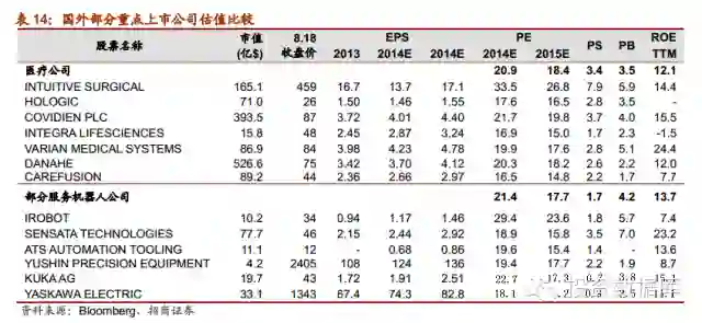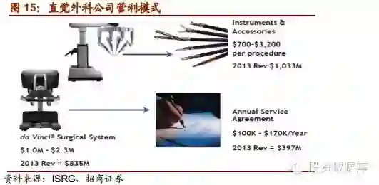 直觉外科公司是全球领先的微创机器人辅助手术机器人公司,2013年营收达22.65亿美元,截止2014年第一季度达芬奇机器人累计销售数量为3039台,2014年8月总市值达159.60亿美元。