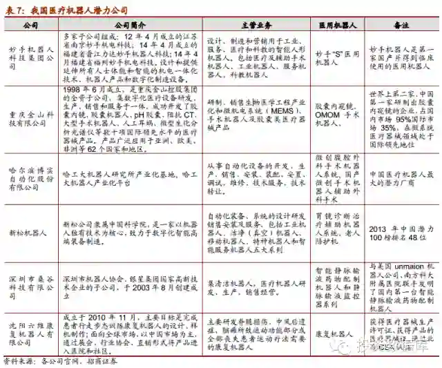 随着医用机器人技术的不断突破和发展,从2005年开始我国有一批重点高校科研医院单位及研究所在研究医用机器人系统并取得了一些小成就,比如哈工大的微创腹腔外科手术机器已经成功被专家验收,天津大学的妙手机器人在今年3月份开始临床使用;同时,随着医用机器人商业化市场化的可能性愈发明晰,已经有部分企业正在生产或者打算进军医用机器人细分行业,其中就包括机器人领先企业的博实股份和新松机器人。