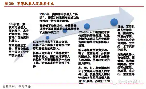 发展历史:三代演进。军事机器人从60年代开始研制,至今已经有了三代的演进。第一代的机器人是“遥控操作器”,第二代机器人是按事先编好的程序,自动重复完成某种操作,第三代机器人是智能机器人,它能利用各种传感器获取环境信息,然后利用智能技术进行识别、理解、推理并最后做出规划决策,是一种能通过自主行动实现预定目标的高级机器人。目前世界各国军用机器人已达上百种之多,主要应用于侦察、排雷、防化、进攻、防御以及保障等各个领域。无人化、机器人兵器是高技术领域中多学科交叉的技术结晶,包括微电子、光电子、纳米、微机电、计算机、新材料、新动力及航天等高新技术,集中了当今科学技术的许多尖端成果。在未来战争中,自动机器人士兵以后可能会成为对敌作战的军事行动的绝对主力。
