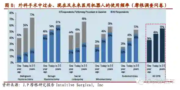 虽然当前医用机器人普及率还很低,并且安装的大部分是发达国家,但摩根的近期的一个调查研究中问及外科医生们未来他们会在自己在手术中多高频率的使用医用机器人,数据表明美国的外科医生们认为未来3-5年里医用机器人在手术中的使用率会迅速上升到一个比较高的层次,约占50%,医用机器人市场潜力巨大。IFR预测在未来的4年里,医疗机器会以每年19%的速度增长,2016年全球市场规模估计会增长到119亿美元。