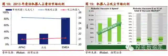 智能吸尘机器人是一个巨大的市场,随着经济水平和技术的提高,扫地机器人将会替代更多的传统型扫地设备,2013年数据统计,在家庭扫地市场上,北美市场为22亿美元,机器人占18%;欧洲、中东及非洲地区(EMEA)市场达25亿美元,机器人占20%;环太平洋与日本(APAC)市场为22亿美元,其中机器人占16%。