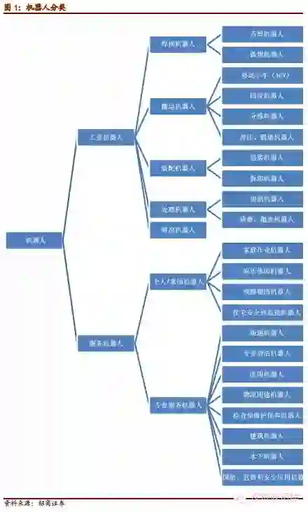 服务机器人是机器人家族中的一个年轻成员,与工业机器人对应,应用领域十分广泛,参照国际机器人联盟(IFR)按照应用领域划分的分类,将服务机器人分为个人/家用机器人(Personal/DomesticRobots)和专业服务机器人(ProfessionalServiceRobots)两大类。服务机器人的应用范围很广,主要从事维护保养、修理、运输、清洗、保安、救援、监护等作。其中,个人/家用机器人主要包括:家庭作业机器人、娱乐休闲机器人、残障辅助机器人、住宅安全和监视机器人等;专业服务机器人主要包括:场地机器人(Fieldrobotics)、专业清洁机器人、医用机器人、物流用途机器人、检查和维护保养机器人、建筑机器人、水下机器人,以及国防、营救和安全应用机器人等等。
