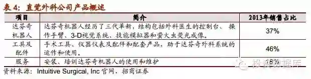 直觉外科公司以销售其达芬奇机器人系统及其配件为主,辅之提供相应的安装和培训服务,销售机器本身贡献了大部分的收入,但近年来销售配件及提供服务在收入所占的比例越来越大,13年工具及配件收入超过达芬奇系统占比46%。