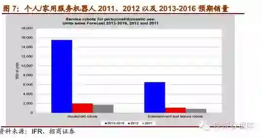 对于个人/家用服务机器人,IFR预测2013-2016年估计会有220万个人/家用机器人得到销售。其中家用机器人销量估计为1550万台,销售额达56亿美元;娱乐机器人为350万台;教育类机器人300万台;残障辅助机器人估计为6400台。随着相互学习与共享知识云机器人技术获得重大突破,小型家庭用辅助机器人大幅度降低生产成本,将在2020年之前形成至少累计416亿美元的新兴市场;另一方面虽然残障辅助机器起步还是很慢,但可预测未来20年会有高速增长。