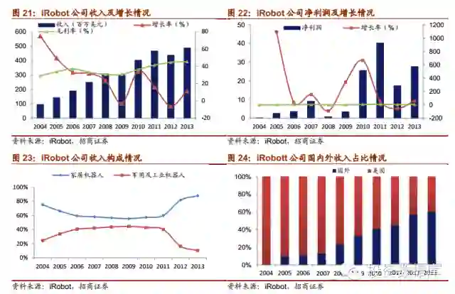 iRobot是家居清洁机器人的领先企业,产品战略布局以家居清洁机器人为主。2014年上半年实现营收2.54亿美元,2013年收入达4.87亿美元,全球市场占有率超过60%,2014年8月总市值为10.10亿美元。