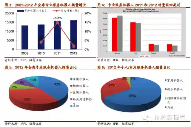 专业服务机器人:1998年至今,专业服务机器人累计销量已超过12.6万台。专业服务机器人2012年总销量为16067台,比2011年的15776台增长了2%,而2012年销售额为34.2亿美元,环比略降1%。其中军用机器人销量为6200台,约占总销量40%;场地机器人销量为5300台,占销量比例33%;医用机器人销量1308台,环比上升20%,占总销量8%;物流用途机器人1376台,环比上升11%,占专业服务机器人总量比例9%,销售额为1.96亿美元。在专业服务机器人中,医用和物流用途机器人是增长潜力最大的两类专业服务机器人。