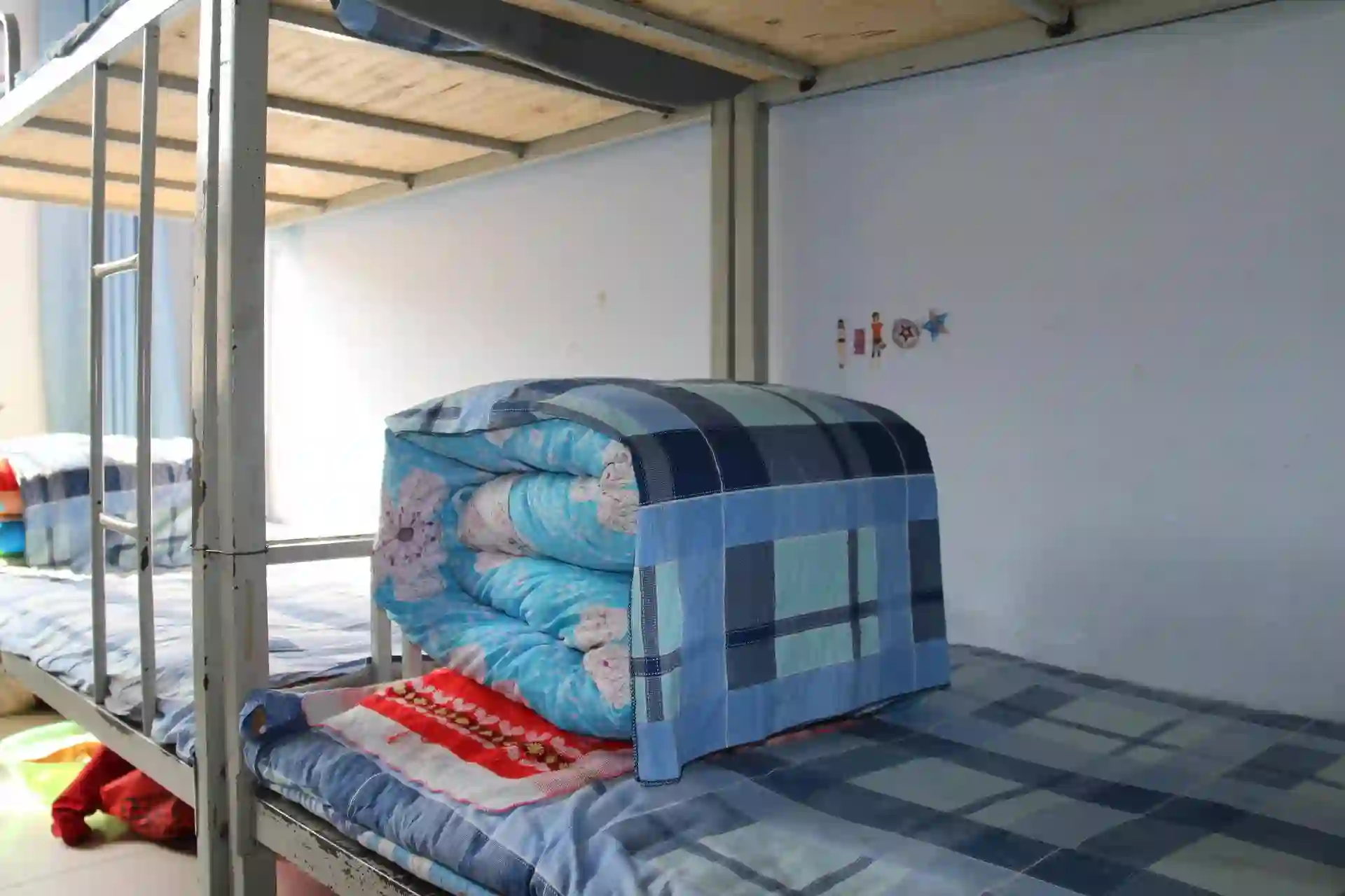 孩子们的床铺特写,方方正正的“豆腐块儿”