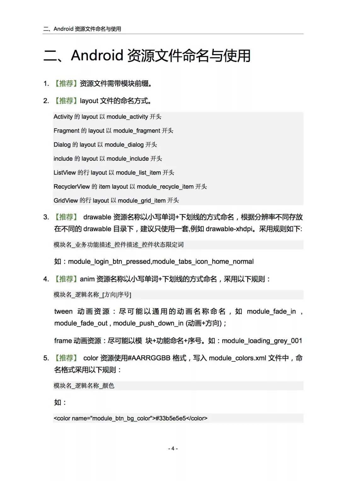 本手册以开发者为中心视角分为Java语言规范(遵循《阿里巴巴Java开发手册》),Android资源文件命名与使用,Android基本组件,UI与布局,进程、线程与消息通信,文件与数据库,Bitmap、Drawable与动画,安全以及其他等九大部分。