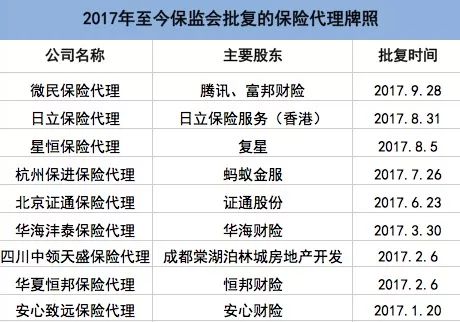 据保监会官网信息统计,2017年以来,保监会共批复了9家保险代理公司资格(如下图)。除了微民保险,7月,蚂蚁金服旗下的杭州保进保险代理有限公司也获得了保监会批准。