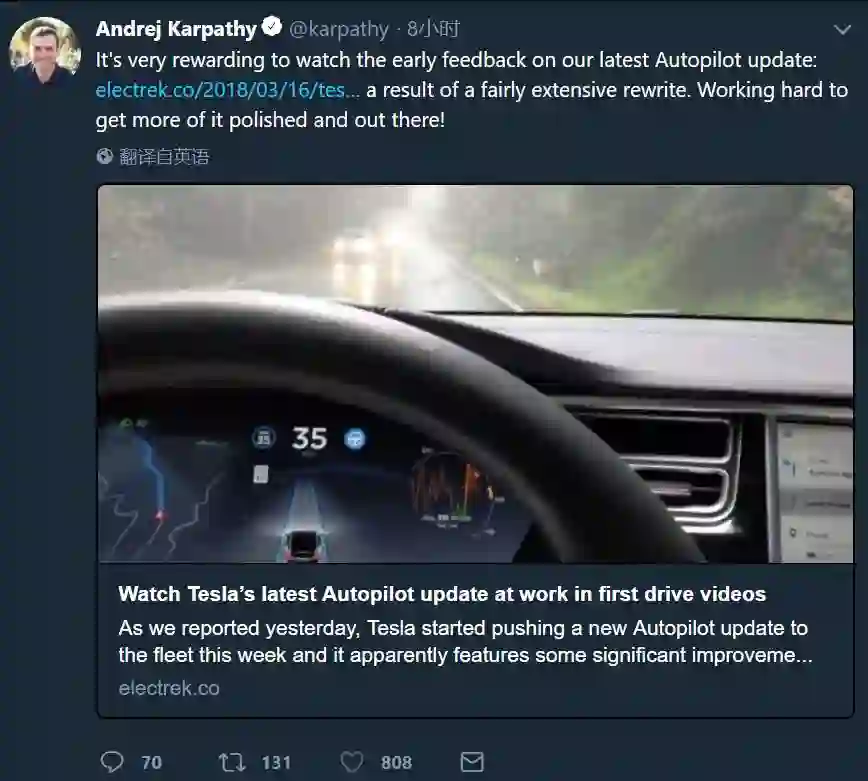 特斯拉人工智能和自动驾驶视觉总监 Andrej Karpathy 非常高兴能够看到人们对新一代自动驾驶系统作出的反馈,他表示 Autopilot 2.0 软件系统经历了「相当大规模的重写」。