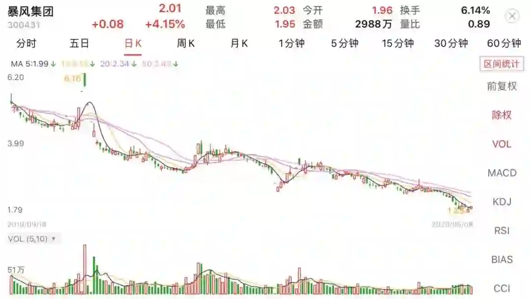 截至5月8日收盘,暴风集团二级市场股价报收2.01元/股,总市值6.62亿元。