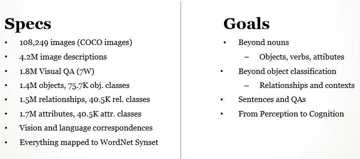 不仅如此,目前的技术已经可以实现对一张复杂照片中的内容进行自然语言描述,并回答相应问题了。这说明深度学习可以理解图片中的内容,并将其转化为可掌握的知识。虽然这一过程还非常基础,但这有助于拉近机器与人类的距离。图像描述一般也有专用的数据集,例如 Visual Genome Dataset 等。该数据集如下有 4.2M 的图像描述和 1.5M 的关系标注,它是基于目标分类实现关系和情景推理的优秀数据集。ImageNet 的下一步很可能就要传递给这些开放、大规模、详细的数据集。