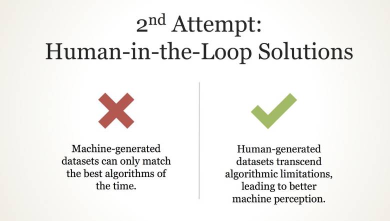 第二种方式:人类参与的解决方案。机器生成的数据集只能匹配一时的最佳算法,而人类生成的数据集超越了算法限制,能够生成更好的机器感知。