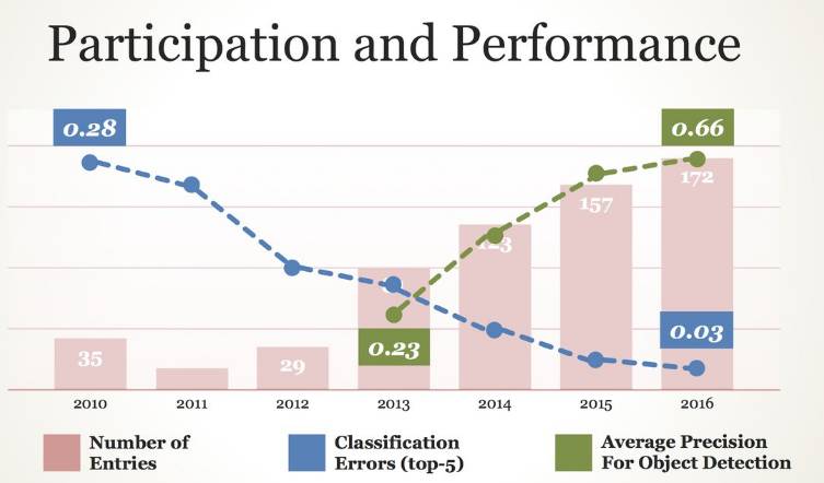 一张图总结 2010-2016 年的 ImageNet 挑战赛成果:分类错误率从 0.28 降到了 0.03;物体识别的平均准确率从 0.23 上升到了 0.66。