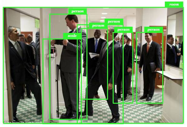 在计算视觉的机眼中,识别的物体永远都只是类别。如下所示,机器可以轻松地识别每个物体(如人和房间等),但是机器视觉也仅仅只能做到识别了,它不会思考这些人到底在干什么,他们为什么都站在这,他们之间的关系是什么。而人类即使识别物体的准确率可能还不及机器,但我们的视觉可以带给我们足够的信息以分析整个场景。