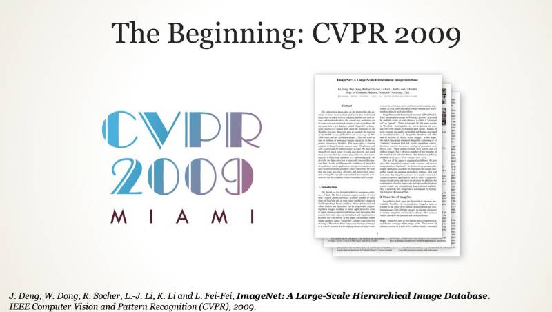 ImageNet 始于 2009 年,当时李飞飞、Jia Deng 等研究员在 CVPR 2009 上发表了一篇名为《ImageNet: A Large-Scale Hierarchical Image Database》的论文,之后就是 7 届 ImageNet 挑战赛的开始(2010 年开始)。