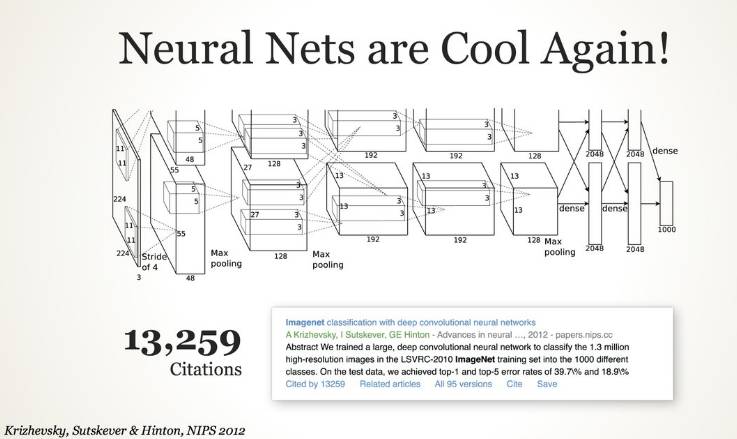 除此之外,还取得了一些意料之外的成果:神经网络再一次流行起来,并且越来越流行。演讲者举例进行了说明。在使用深度卷积神经网络进行 ImageNet 分类任务中,有一篇成果显著的论文,即《imagenet classification with deep convolutional neural networks》(Krizhevsky, Sutskever & Hinton, NIPS 2012),该论文摘要如下:我们训练了一个大型的深度卷积神经网络,把 ILSVRC 2010 训练集中的 130 万高分辨率图像分为了 1000 个不同的类别。在测试数据中,我们获得了 top1 和 top 5 的误差率,分别是 39.7\% 和 18.9\%。该论文的引用数量为 13259,神经网络之火热可见一斑。同时演讲者还给出了该深度卷积神经网络的图示。
