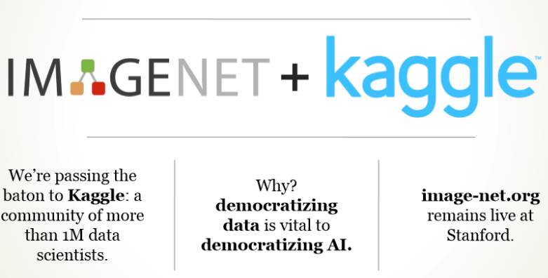 随着与 Kaggle 合并,ImageNet 挑战赛将会接入这个拥有多达 100 万数据科学家的庞大社区之中,为更多人带来帮助——这与「人工智能民主化」的理念相呼应。与此同时,该项目的原网址 image-net.org 仍将由斯坦福大学继续运营。