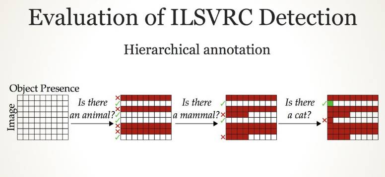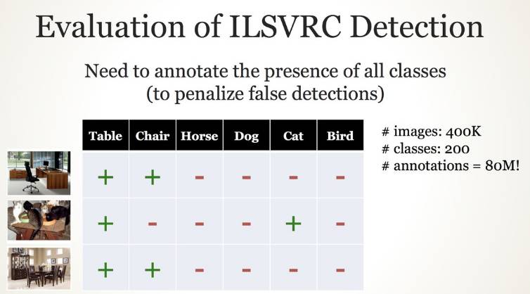 ILSVRC 检测的评估需要注解所有出现的类别,从而对虚假检测做出惩罚。ILSVRC 图像达 40 万张,类别数量为 200,注解有 8000 万个。