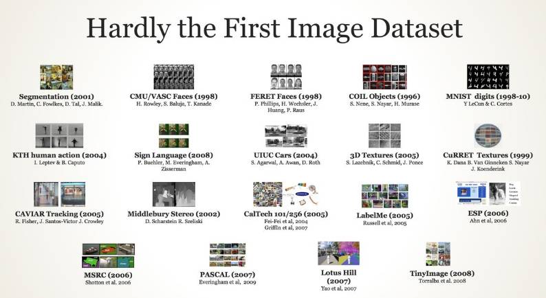 在演讲中,演讲者首先介绍了 2009 年之前的图像数据集历史:从 1998 年 CMU 的 Vasc Faces 到 2008 年的 TinyImage 数据集。