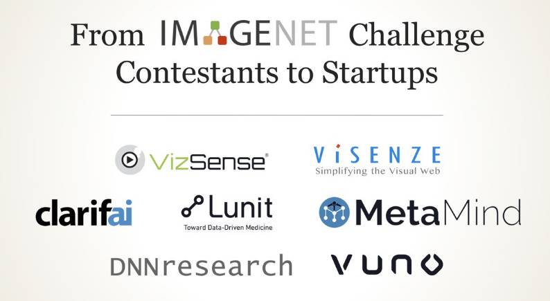 众多 ImageNet 挑战赛的参与者发展成了创业公司,其中包括机器之心很早就关注到的图像识别创业公司 Clarifai(机器之心 AI00 获奖者)、被谷歌收购的 DNNresearch。