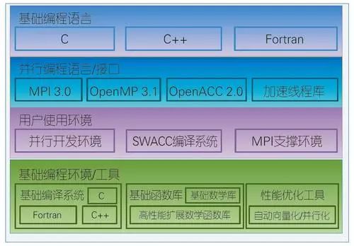 神威·太湖之光计算机系统支持主流的基础编程语言,满足实际课题编译需求,支持MPI3.0、OpenMP3.1、Pthreads、OpenACC2.0等与国际接轨的并行编程标准,以及消息并行编程模型、共享并行编程模型和加速并行编程模型,能够满足科学与工程计算课题开发和移植的多样性需要。