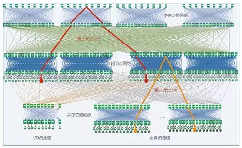 为满足数万个节点规模下通信密集课题和I/O密集课题的不同性能要求,神威·太湖之光研制者提出了一种由超节点网络、共享资源网络和中央交换网络组成的高流量可扩展复合网络结构,实现了全机40960个运算节点和240个I/O节点的高带宽低延迟通信,最大通信步长仅7步,系统对分带宽70TB/s。