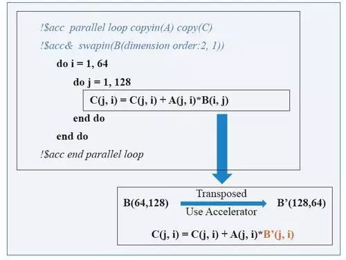 其次,扩充了两种优化的数据传输控制子句,分别是swap/swapin/swapout和pack/packin/packout,二者都是通过数据变换来提升数据传输效率的有效手段。Swap系列子句主要用来处理某些访问方式不连续的数组数据的拷贝,先将这些数组转置,然后通过连续的数据传输操作进行传输,以提高数据传输的效率,具体用法见图7。