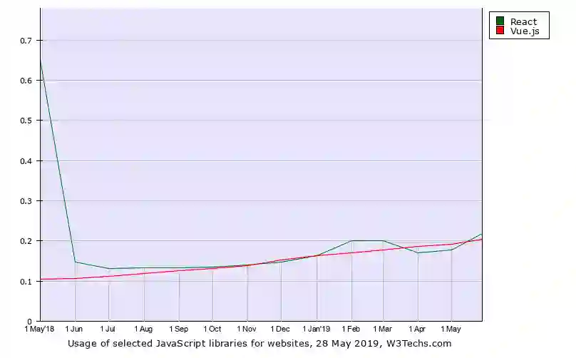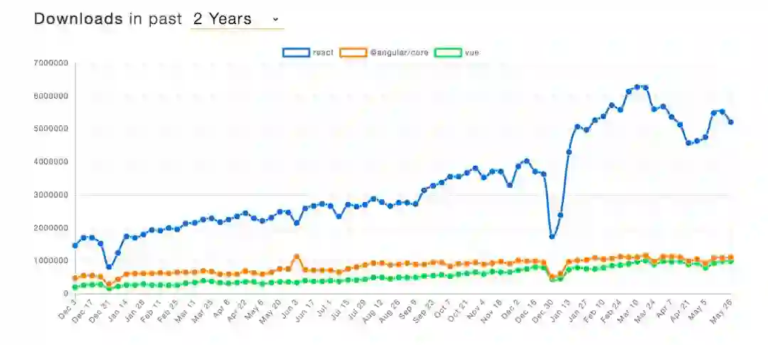 那么,从现在开始的 5 年内,哪个框架会占据统治地位呢?没有人知道。但是,可以肯定地说,在原生 JS 生态系统中,这将是一个大有可为的方面。在这个生态系统中,Web 组件统治了 DOM。React 居 NPM 下载量之后。然而,看看这些数字: https://w3techs.com/technologies/comparison/js-react,js-vuejs 在实际的 Web 使用中,差距似乎非常小。