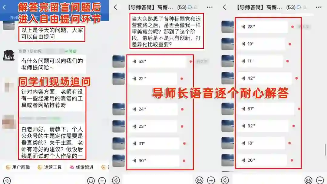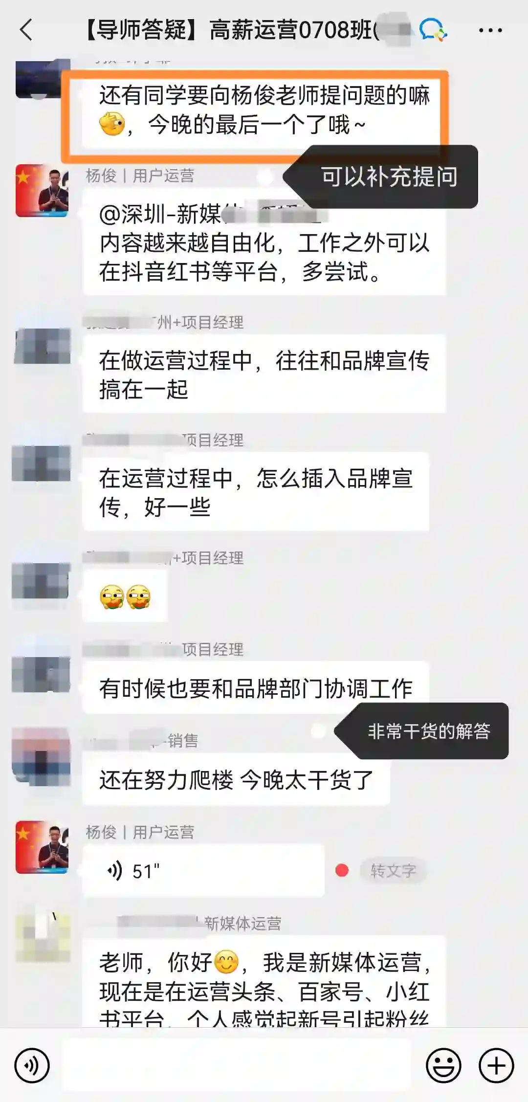 关于运营的一切问题,都可以问,我们的老师将进行定期专场答疑。(从建班群开始,老师就会一直在班群里陪伴大家)