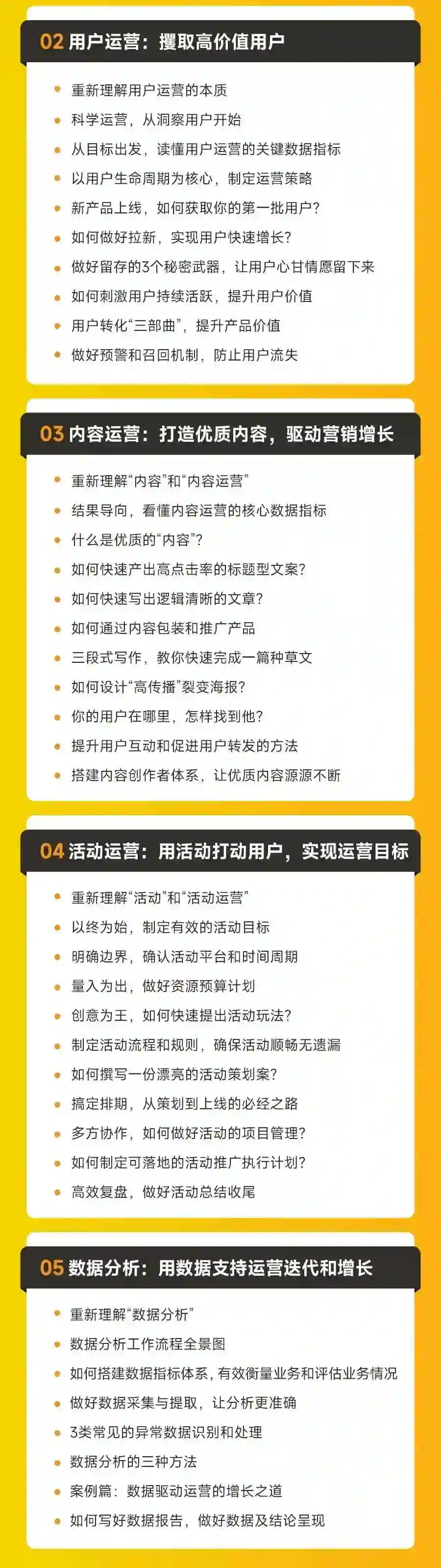 所以我们的课程会包括用户运营、内容运营、活动运营、数据运营等模块的内容,帮助大家全面地搭建运营知识体系。